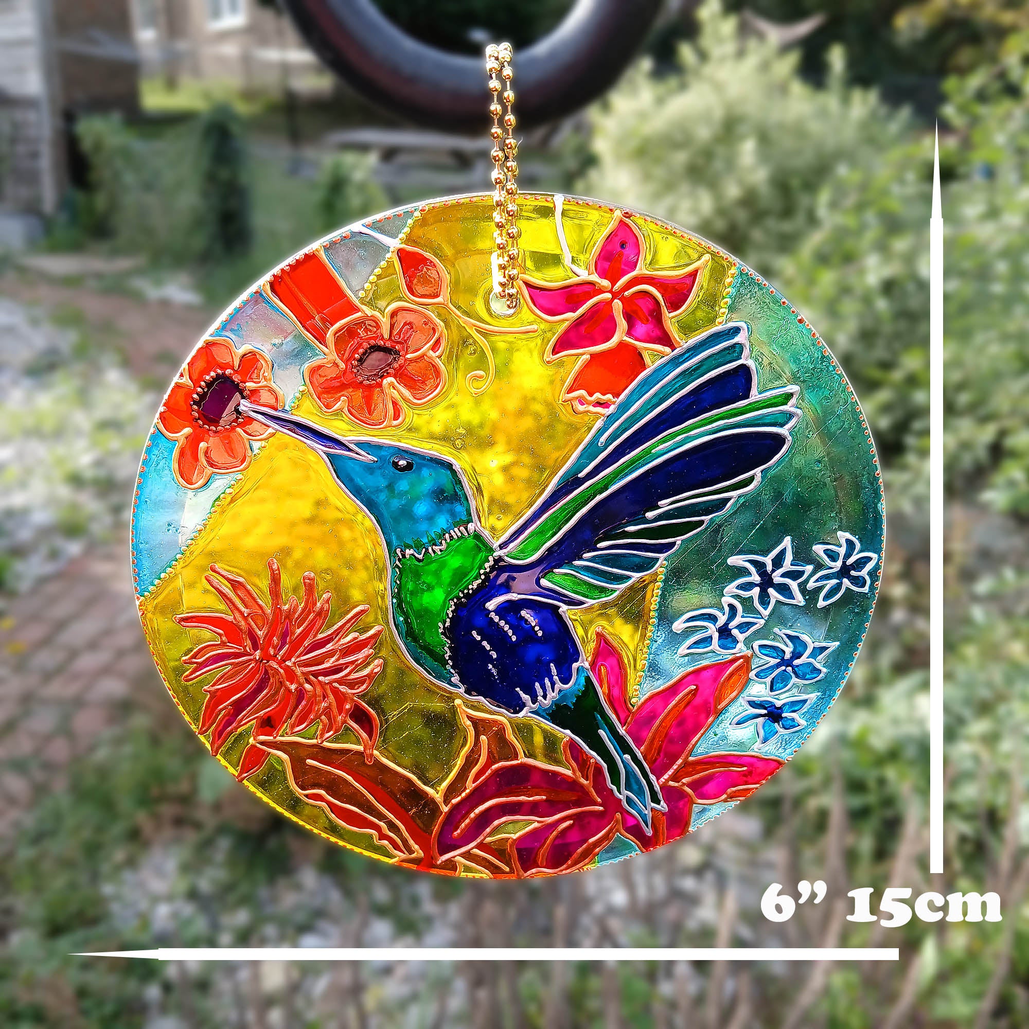 This vibrant hand painted suncatcher celebrates warm sunshine and the life it brings - an exotic tropical hummingbird drinks from colourful flowers in exuberant nature